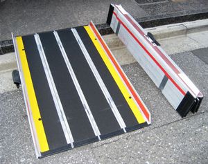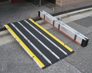スロープとは?主に車いすなどの移動で、段差を解消するために使用するものです。取り付けに際し、特別な工事を伴わないものに限ります。スロープ部分が1枚板で折りたためるもの、車いすの車輪の位置に合わせて取り付けられる2本組のものなどがあります。